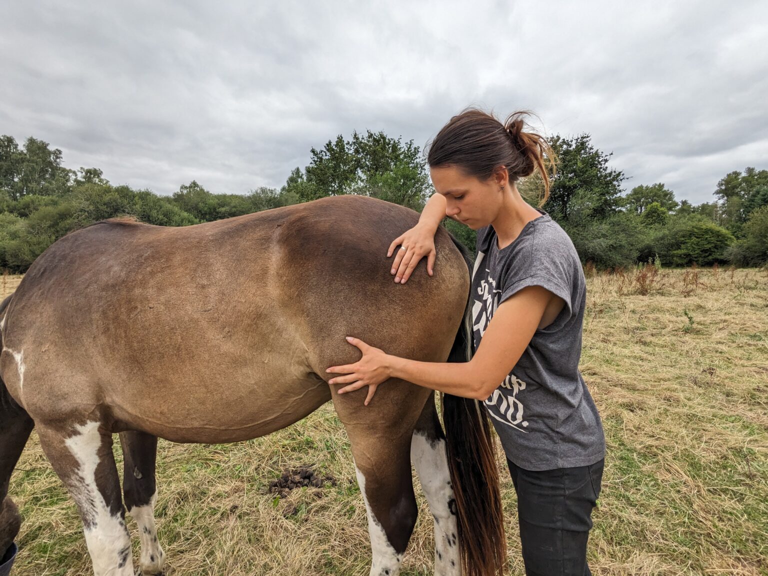 La séance se termine par des effleurages doux pour permettre à votre cheval d'intégrer le travail. Je vous transmets ensuite mes observations et mes conseils pour prolonger les bienfaits du massage au quotidien.